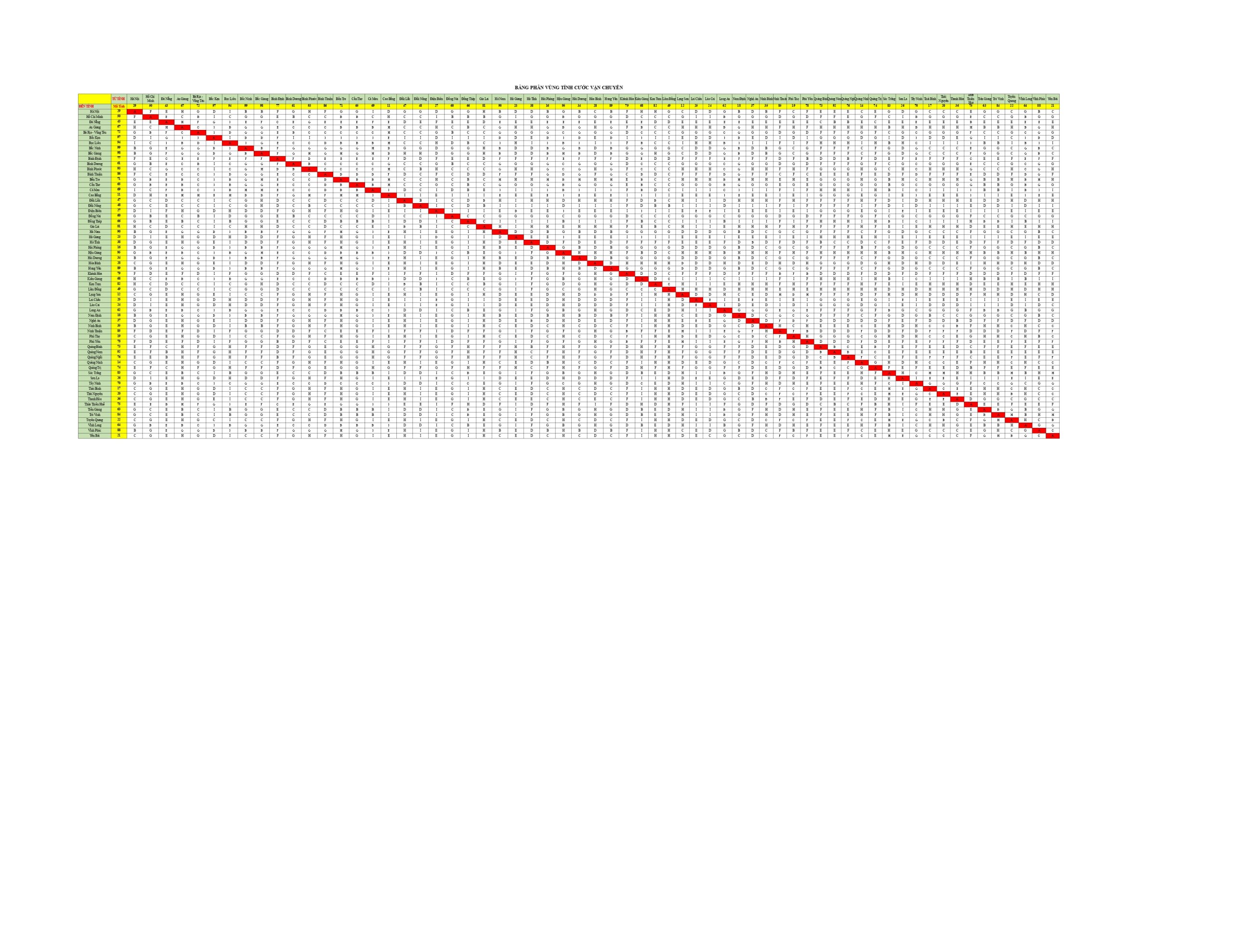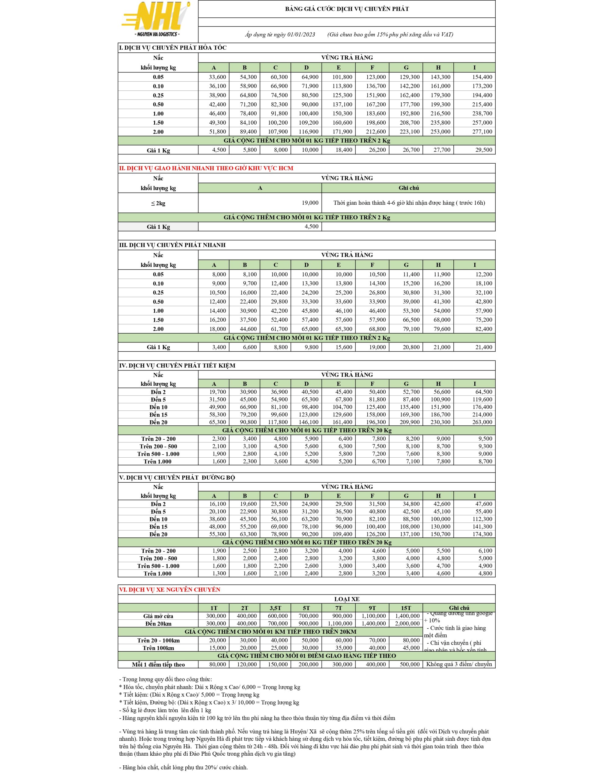 Bảng Giá Vận chuyển